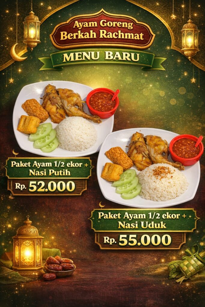 Paket Ayam 1/2 Ekor + Nasi Uduk Nikmati ayam goreng 1/2 ekor yang kaya rempah dipadukan dengan nasi uduk . Kombinasi yang bikin nagih, pas untuk pecinta rasa yang lebih wangi dan berlapis Ayam goreng 1/2 ekor khas Berkah Rachmat dipadukan dengan nasi uduk yang dimasak dengan santan segar dan rempah pilihan